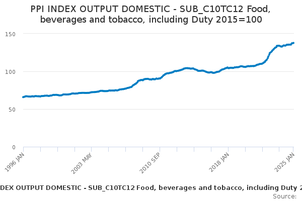 Download this time seriesPPI INDEX OUTPUT DOMESTIC - SUB_C10TC12 Food, beverages and tobacco, including Duty 2015=100