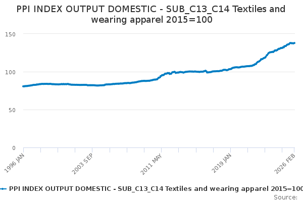 Download this time seriesPPI INDEX OUTPUT DOMESTIC - SUB_C13_C14 Textiles and wearing apparel 2015=100
