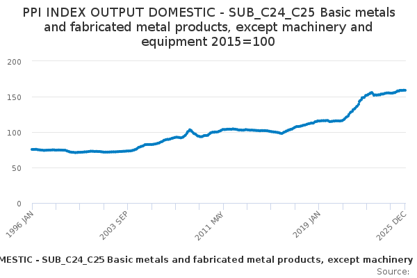 Download this time seriesPPI INDEX OUTPUT DOMESTIC - SUB_C24_C25 Basic metals and fabricated metal products, except machinery and equipment 2015=100
