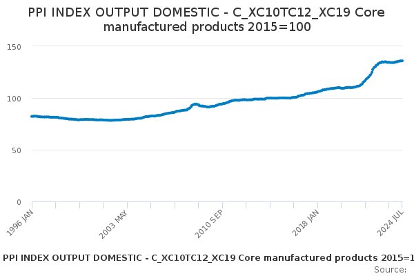 Download this time seriesPPI INDEX OUTPUT DOMESTIC - C_XC10TC12_XC19 Core manufactured products 2015=100