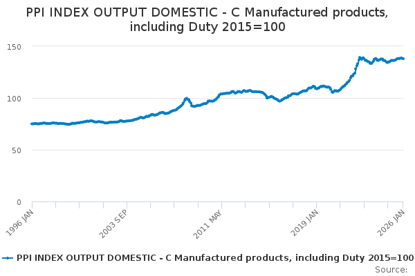 Download this time seriesPPI INDEX OUTPUT DOMESTIC - C Manufactured products, including Duty 2015=100