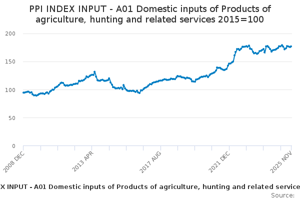 Download this time seriesPPI INDEX INPUT - A01 Domestic inputs of Products of agriculture, hunting and related services 2015=100