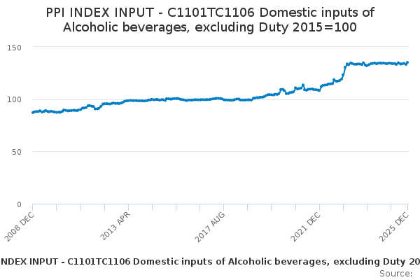 Download this time seriesPPI INDEX INPUT - C1101TC1106 Domestic inputs of Alcoholic beverages, excluding Duty 2015=100