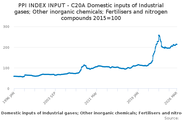 Download this time seriesPPI INDEX INPUT - C20A Domestic inputs of Industrial gases; Other inorganic chemicals; Fertilisers and nitrogen compounds 2015=100
