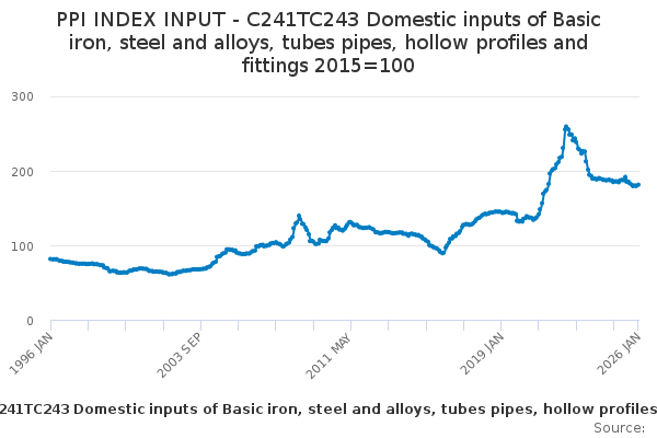 Download this time seriesPPI INDEX INPUT - C241TC243 Domestic inputs of Basic iron, steel and alloys, tubes pipes, hollow profiles and fittings 2015=100