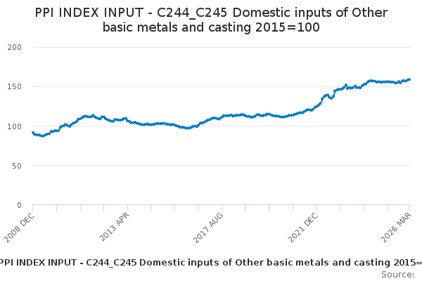 Download this time seriesPPI INDEX INPUT - C244_C245 Domestic inputs of Other basic metals and casting 2015=100