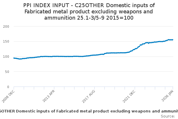 Download this time seriesPPI INDEX INPUT - C25OTHER Domestic inputs of Fabricated metal product excluding weapons and ammunition 25.1-3/5-9 2015=100
