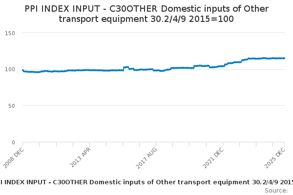 Download this time seriesPPI INDEX INPUT - C30OTHER Domestic inputs of Other transport equipment 30.2/4/9 2015=100