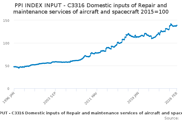 Download this time seriesPPI INDEX INPUT - C3316 Domestic inputs of Repair and maintenance services of aircraft and spacecraft 2015=100