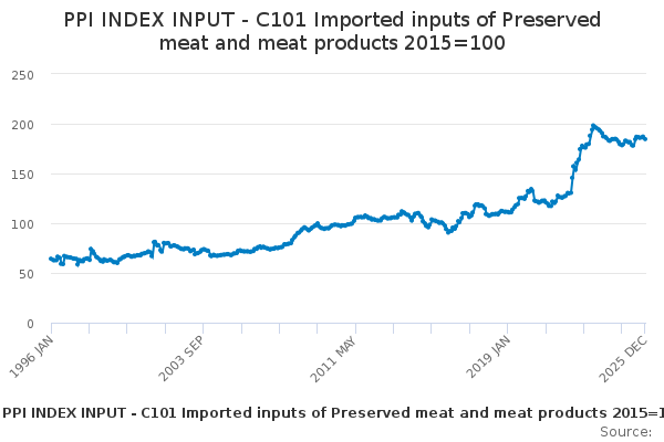 Download this time seriesPPI INDEX INPUT - C101 Imported inputs of Preserved meat and meat products 2015=100