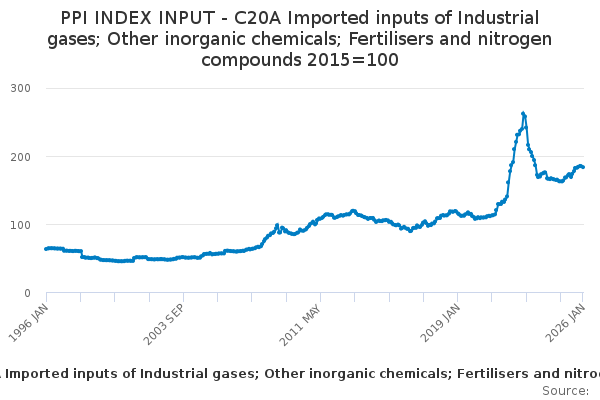 Download this time seriesPPI INDEX INPUT - C20A Imported inputs of Industrial gases; Other inorganic chemicals; Fertilisers and nitrogen compounds 2015=100