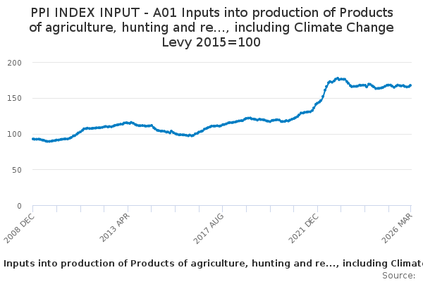 Download this time seriesPPI INDEX INPUT - A01 Inputs into production of Products of agriculture, hunting and re..., including Climate Change Levy 2015=100
