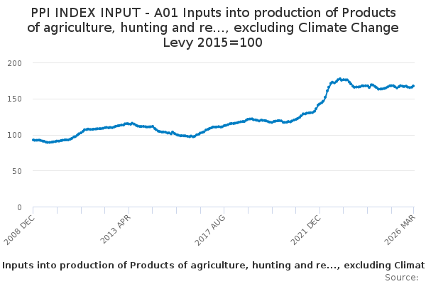 Download this time seriesPPI INDEX INPUT - A01 Inputs into production of Products of agriculture, hunting and re..., excluding Climate Change Levy 2015=100