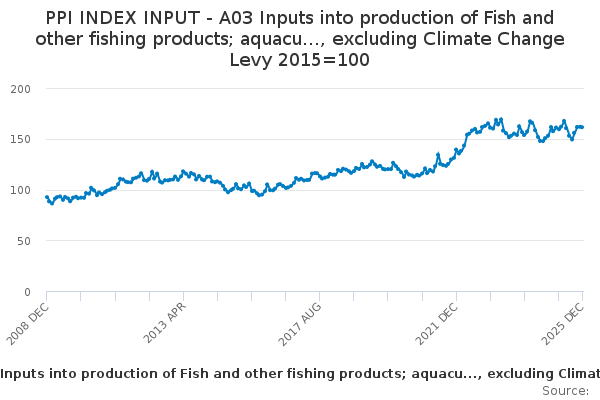 Download this time seriesPPI INDEX INPUT - A03 Inputs into production of Fish and other fishing products; aquacu..., excluding Climate Change Levy 2015=100