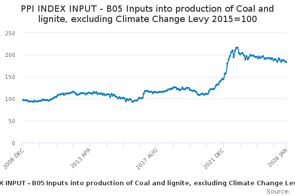 Download this time seriesPPI INDEX INPUT - B05 Inputs into production of Coal and lignite, excluding Climate Change Levy 2015=100