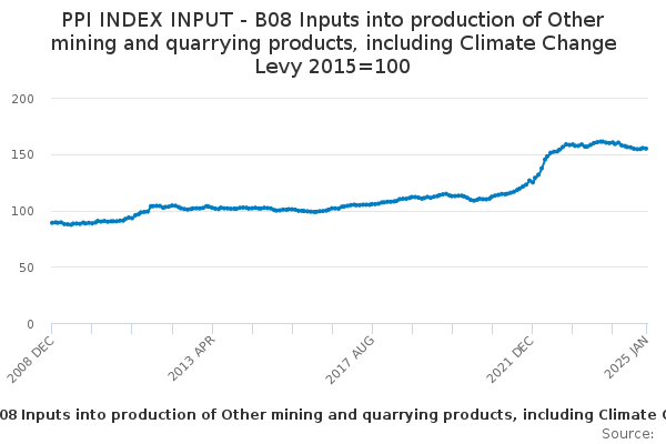 Download this time seriesPPI INDEX INPUT - B08 Inputs into production of Other mining and quarrying products, including Climate Change Levy 2015=100