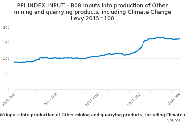 Download this time seriesPPI INDEX INPUT - B08 Inputs into production of Other mining and quarrying products, including Climate Change Levy 2015=100