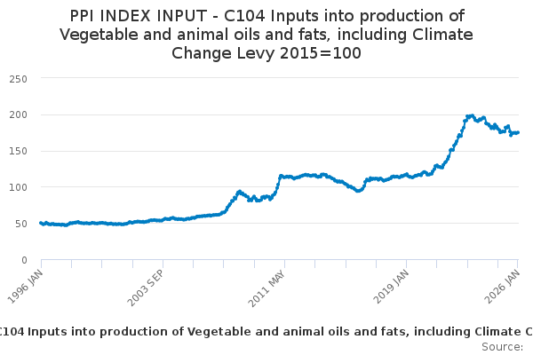 Download this time seriesPPI INDEX INPUT - C104 Inputs into production of Vegetable and animal oils and fats, including Climate Change Levy 2015=100