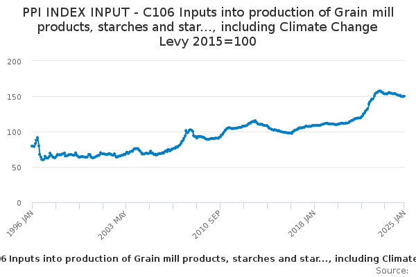 Download this time seriesPPI INDEX INPUT - C106 Inputs into production of Grain mill products, starches and star..., including Climate Change Levy 2015=100