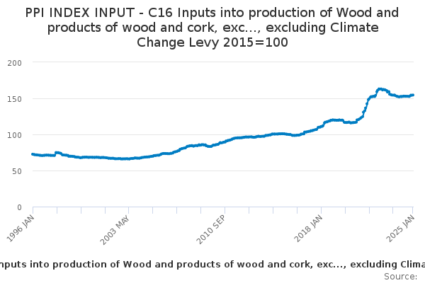 Download this time seriesPPI INDEX INPUT - C16 Inputs into production of Wood and products of wood and cork, exc..., excluding Climate Change Levy 2015=100