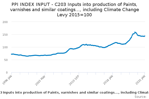 Download this time seriesPPI INDEX INPUT - C203 Inputs into production of Paints, varnishes and similar coatings..., including Climate Change Levy 2015=100