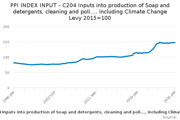 Download this time seriesPPI INDEX INPUT - C204 Inputs into production of Soap and detergents, cleaning and poli..., including Climate Change Levy 2015=100