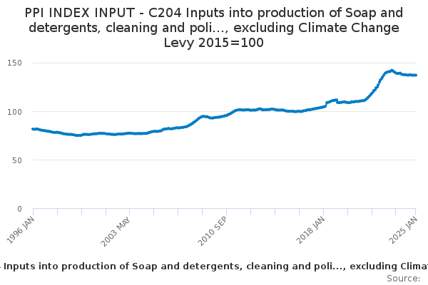 Download this time seriesPPI INDEX INPUT - C204 Inputs into production of Soap and detergents, cleaning and poli..., excluding Climate Change Levy 2015=100