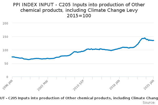 Download this time seriesPPI INDEX INPUT - C205 Inputs into production of Other chemical products, including Climate Change Levy 2015=100