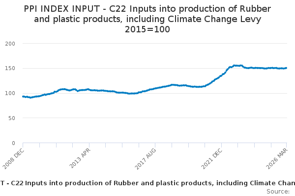 Download this time seriesPPI INDEX INPUT - C22 Inputs into production of Rubber and plastic products, including Climate Change Levy 2015=100