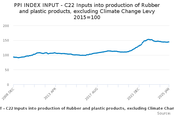 Download this time seriesPPI INDEX INPUT - C22 Inputs into production of Rubber and plastic products, excluding Climate Change Levy 2015=100