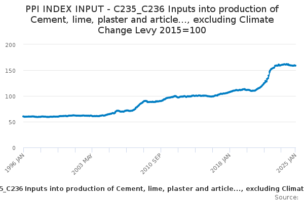 Download this time seriesPPI INDEX INPUT - C235_C236 Inputs into production of Cement, lime, plaster and article..., excluding Climate Change Levy 2015=100