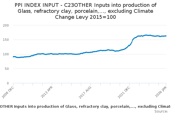 Download this time seriesPPI INDEX INPUT - C23OTHER Inputs into production of Glass, refractory clay, porcelain,..., excluding Climate Change Levy 2015=100