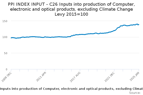 Download this time seriesPPI INDEX INPUT - C26 Inputs into production of Computer, electronic and optical products, excluding Climate Change Levy 2015=100