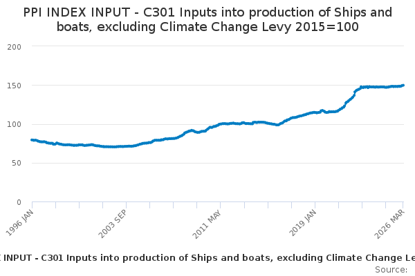 Download this time seriesPPI INDEX INPUT - C301 Inputs into production of Ships and boats, excluding Climate Change Levy 2015=100