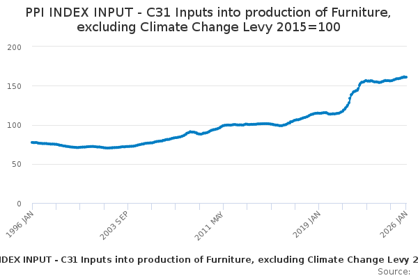 Download this time seriesPPI INDEX INPUT - C31 Inputs into production of Furniture, excluding Climate Change Levy 2015=100