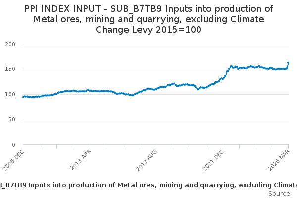 Download this time seriesPPI INDEX INPUT - SUB_B7TB9 Inputs into production of Metal ores, mining and quarrying, excluding Climate Change Levy 2015=100