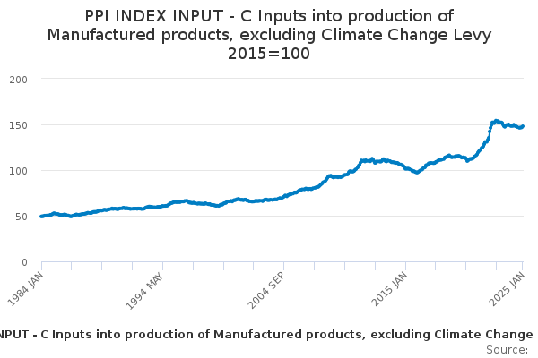 Download this time seriesPPI INDEX INPUT - C Inputs into production of Manufactured products, excluding Climate Change Levy 2015=100