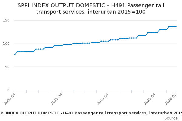 Download this time seriesSPPI INDEX OUTPUT DOMESTIC - H491 Passenger rail transport services, interurban 2015=100