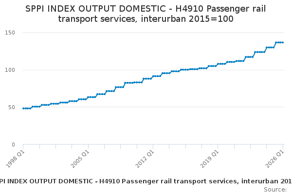 Download this time seriesSPPI INDEX OUTPUT DOMESTIC - H4910 Passenger rail transport services, interurban 2015=100