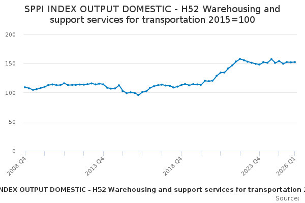 Download this time seriesSPPI INDEX OUTPUT DOMESTIC - H52 Warehousing and support services for transportation 2015=100