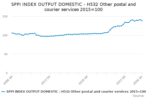 Download this time seriesSPPI INDEX OUTPUT DOMESTIC - H532 Other postal and courier services 2015=100