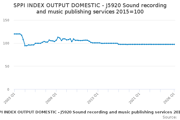 Download this time seriesSPPI INDEX OUTPUT DOMESTIC - J5920 Sound recording and music publishing services 2015=100