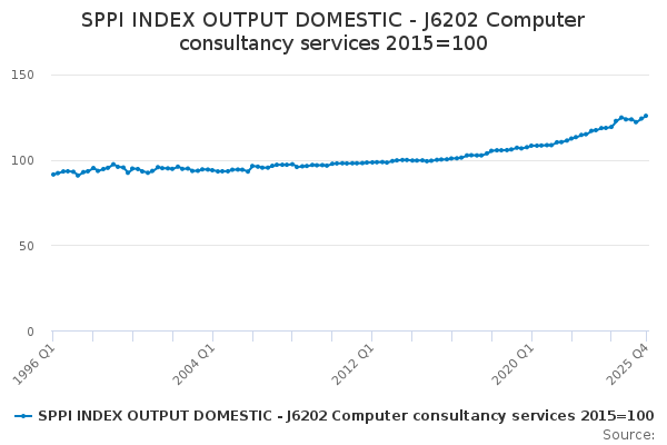 Download this time seriesSPPI INDEX OUTPUT DOMESTIC - J6202 Computer consultancy services 2015=100