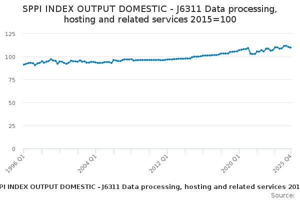 Download this time seriesSPPI INDEX OUTPUT DOMESTIC - J6311 Data processing, hosting and related services 2015=100
