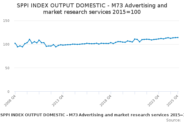 Download this time seriesSPPI INDEX OUTPUT DOMESTIC - M73 Advertising and market research services 2015=100