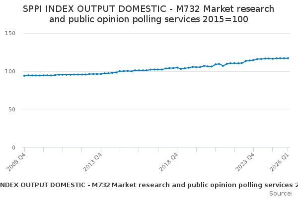 Download this time seriesSPPI INDEX OUTPUT DOMESTIC - M732 Market research and public opinion polling services 2015=100