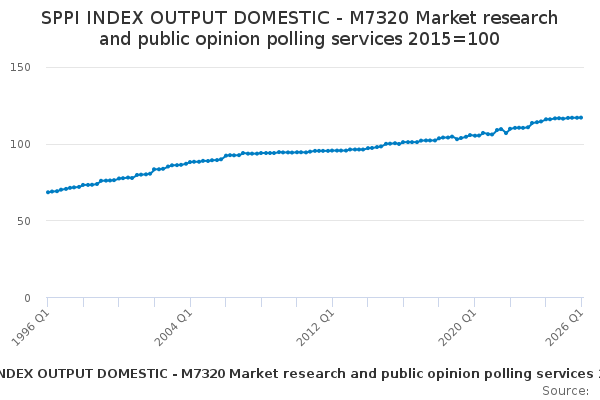 Download this time seriesSPPI INDEX OUTPUT DOMESTIC - M7320 Market research and public opinion polling services 2015=100
