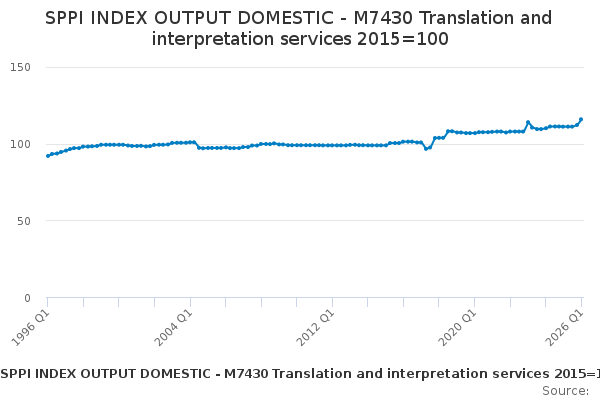 Download this time seriesSPPI INDEX OUTPUT DOMESTIC - M7430 Translation and interpretation services 2015=100