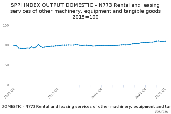 Download this time seriesSPPI INDEX OUTPUT DOMESTIC - N773 Rental and leasing services of other machinery, equipment and tangible goods 2015=100