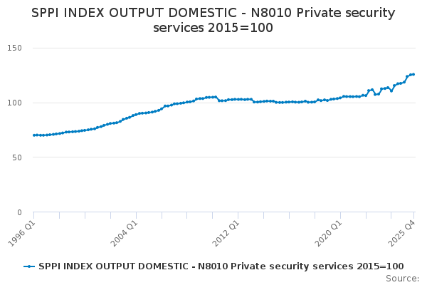 Download this time seriesSPPI INDEX OUTPUT DOMESTIC - N8010 Private security services 2015=100